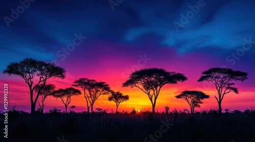 © rak, Obraz premium Silhouettes of Trees Against a Vibrant Sunset
