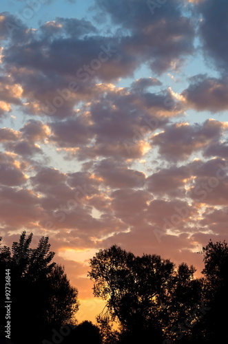 © balakleypb, Fototapeta premium silhouettes of trees on the background of sunrise and clouds