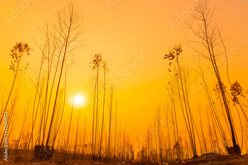 © Chinnachote, Fototapeta premium silhouettes of trees with orange and yellow sky after sunset