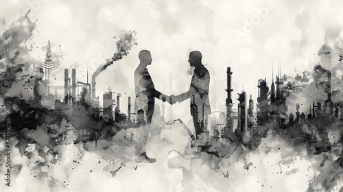 © Montree, Obraz premium Silhouettes of two businessmen shaking hands in front of a polluted cityscape.