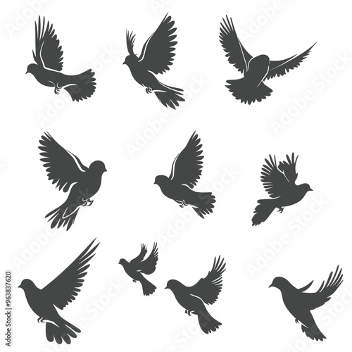 © umut hasanoglu, Fototapeta premium Silhouettes of various birds in flight against a white background.