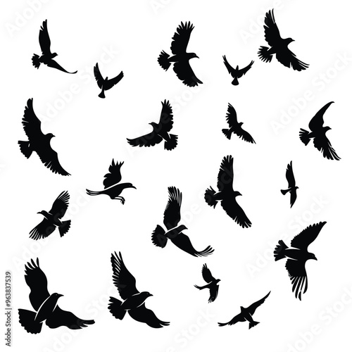 © umut hasanoglu, Obraz premium Silhouettes of various birds in flight set against a white background.