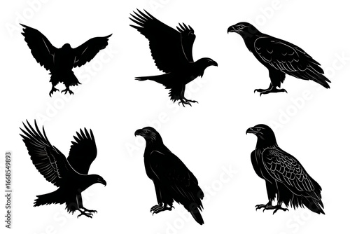 © Noufaldi, Fototapeta premium Silhouettes of various birds of prey in different poses against a plain background