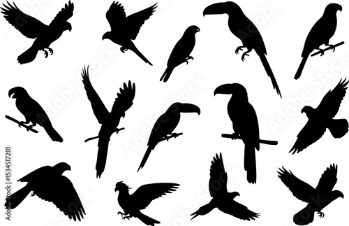 © Stockbundles, Obraz premium Silhouettes of various tropical birds in flight and perched.