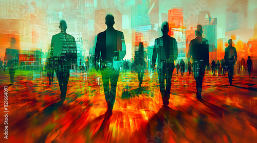 © 用脚 开门, Obraz premium Silhouettes walking through an abstract cityscape
