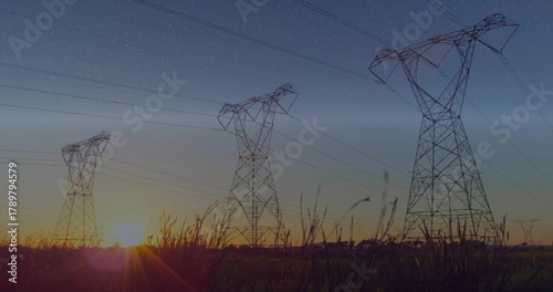© vectorfusionart, Obraz premium Silhouetting three high-voltage towers and power lines over rural field at sunset with tall grasses