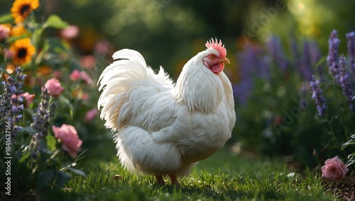 Fototapeta premium Silkie chicken with white fluffy feathers wandering through a lush summer garden, highlighting unique feather texture