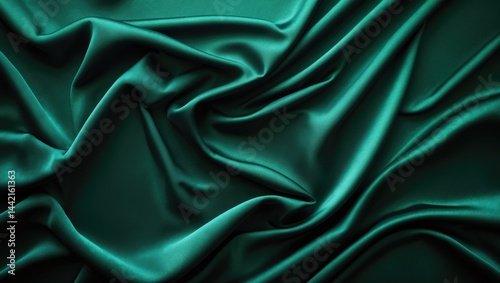 © Cyber Shutter, Fototapeta premium Silky dark green satin background with gentle folds on a smooth surface. Premium backdrop with space for creative design, wide banner, top view, flat lay.