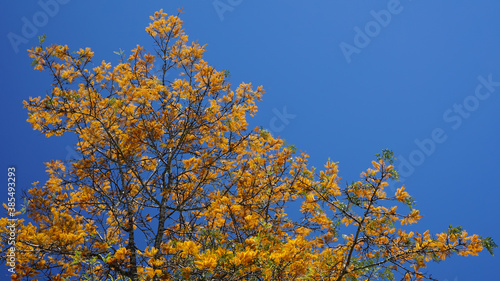 Fototapeta premium Silky oak tree in full bloom. Golden yellow flowers against a clear blue sky.