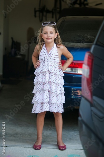 © Ursula Page, Naklejka premium Sill Girl in Garage with Sunglasses Making Faces