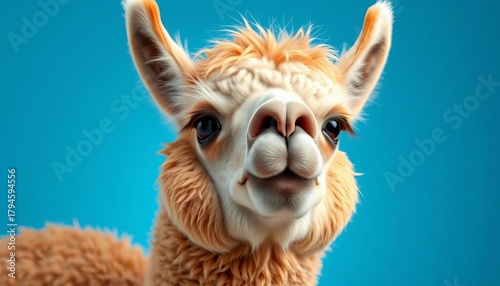 © Teepanun, Obraz premium Silly alpaca llama, goofy expression, isolated on vibrant blue backdrop, happy, fiber