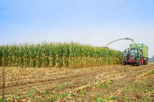 Naklejka premium Silomaisernte, Ackerschlepper und Maishäcksler