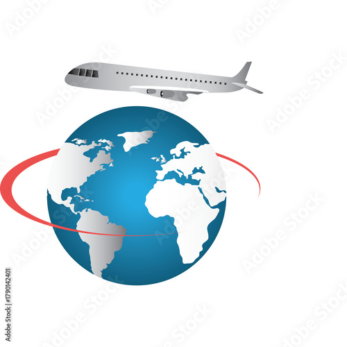Fototapeta premium Silver Airplane Flying Over Blue Globe With Red Orbit Path On Transparent Background