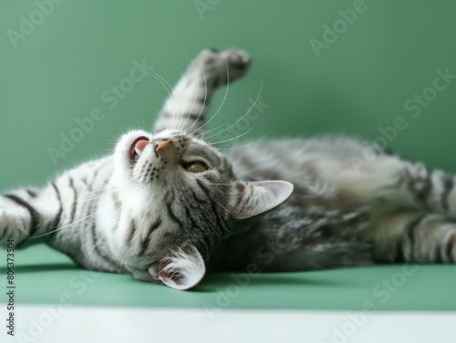 Naklejka premium silver American shorthair tabby cat lying on the white and green background, happy, funny, generated with AI