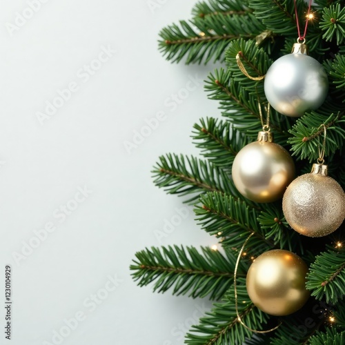 Fototapeta premium Silver and gold metallic ornaments wrapped around a sprig of fir, fir,...
