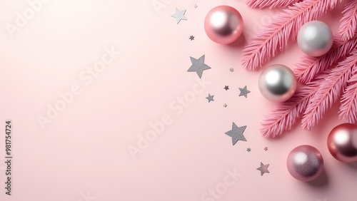 Fototapeta premium Silver and pink baubles with stars on pink pine branches against a pastel pink background