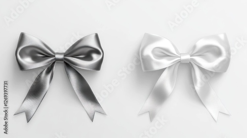 © SlashStd, Naklejka premium Silver and white satin bows on white background; gift wrapping