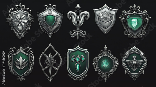 Fototapeta premium Silver award badges with fantasy frames and green decorative elements.Vector cartoon icons set of game labels different shapes, metal emblems with borders in medieval style