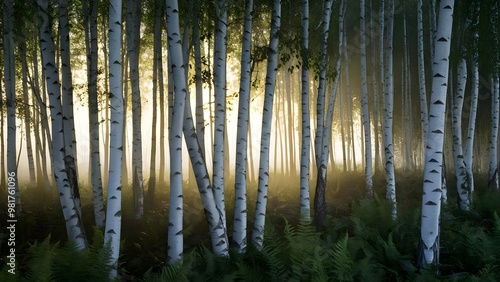 © NovaNicheTee, Naklejka premium Silver birch tree grove with soft morning light