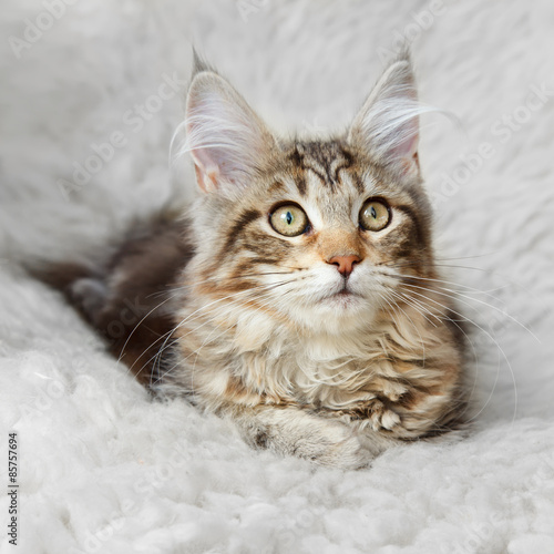 © horheo, Fototapeta premium Silver black kitten maine coon posing on white background fur