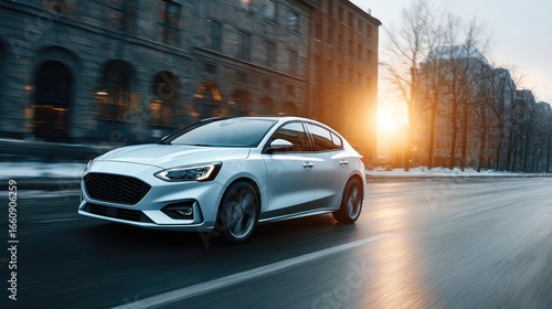Fototapeta premium Silver Car on Winter City Street at Sunset Showing Speed and Urban Elegance