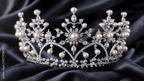 Fototapeta premium silver diadem featuring diamonds and pearls set against the fabric