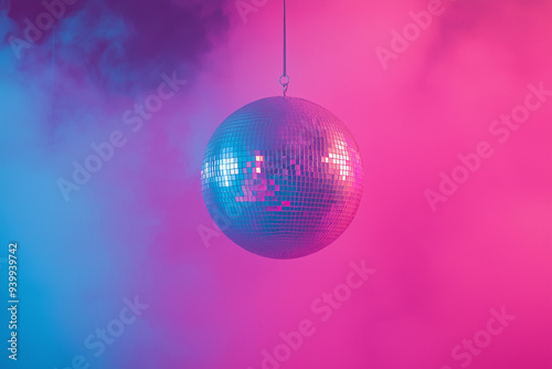 Fototapeta premium silver disco ball reflecting pink and blue light against a background of disco smoke illuminated by pink and blue light, generative AI
