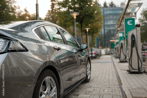 Fototapeta premium Silver Electric Car Charging at Station with Charging Points and Cord Cables...