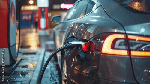Obraz premium Silver electric car refueling at advanced electric station for eco friendly...