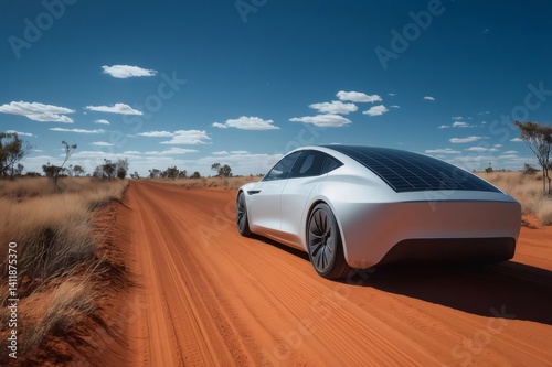 © Татьяна Евдокимова, Fototapeta premium Silver electric vehicle driving on a dirt road across the Australian outback, featuring solar panels on its roof