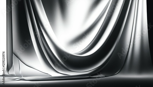 Fototapeta premium silver fabric, flowing drapery, silky texture, dramatic lighting, high contrast, black and white photography, abstract composition, smooth curves, reflective surface, studio setting, minimalist aesthe