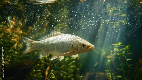 © Stitch, Fototapeta premium Silver fish gliding gracefully through clear aquatic plants under sunlight in a tranquil underwater environment