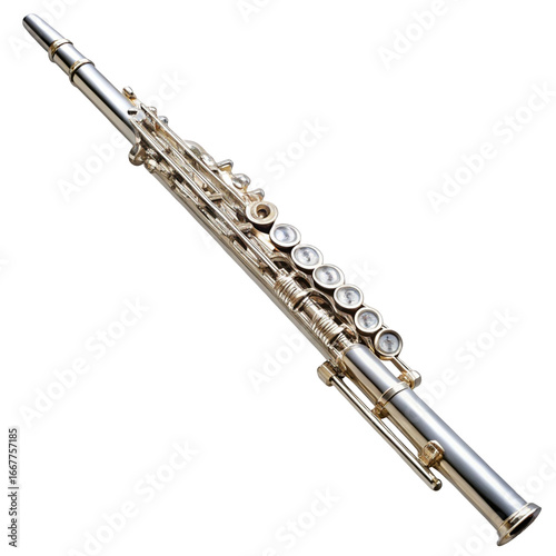 © siddique, Fototapeta premium Silver flute isolated on transparent background, a shiny metal musical instrument with keys, used in classical and orchestral music
