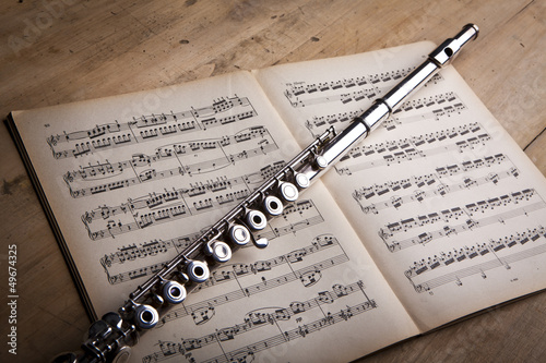 © Tommaso Lizzul, Fototapeta premium Silver flute on an ancient music score background