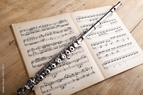 © Tommaso Lizzul, Fototapeta premium Silver flute on an ancient music score background