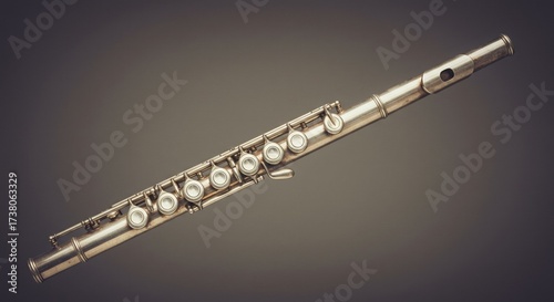 © Vicky, Fototapeta premium Silver Flute on Gray Background, Musical Instrument Detail.