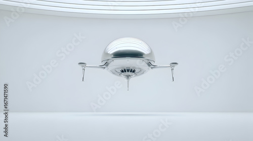 © Rons, Obraz premium Silver Flying Saucer Hovering in Bright White Room with Futuristic Design