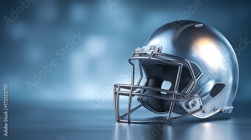 Naklejka premium Silver Football Helmet with Faceguard on Reflective Surface in Stadium Setting