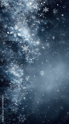 © Yurii Semonov, Obraz premium Silver glitter snowflakes falling on black background with subtle bloom effect