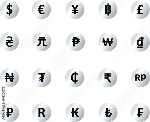 © Usama Zahoor, Naklejka premium Silver Gradient Global Currency Icons