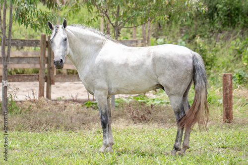 © Belarmino, Fototapeta premium Silver gray horse. Beautiful example of a horse of the Mangalarga Marchador breed. Stallion horse loose in the field.