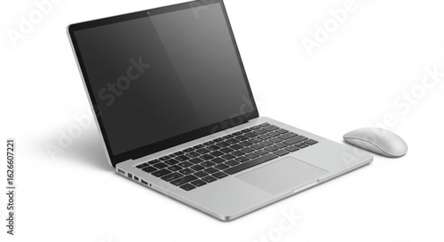 Fototapeta premium Silver laptop with a dark screen and a white wireless mouse on a clean white...