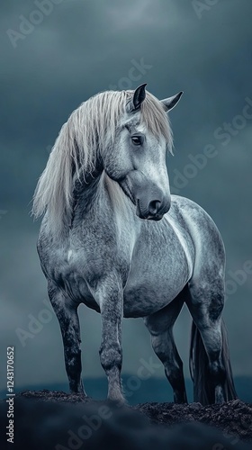 Fototapeta premium Silver-maned Percheron horse, stormy blue-gray background, bold contrast.