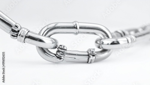 © ruangrit19, Obraz premium Silver Metal Chain Links on White Background Strength Interlocking Connection Security Bond Object.