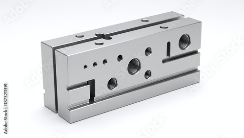 © Dua9Agency, Fototapeta premium Silver metal industrial component with multiple threaded holes shown in a clean studio lighting setup. isolated on white background