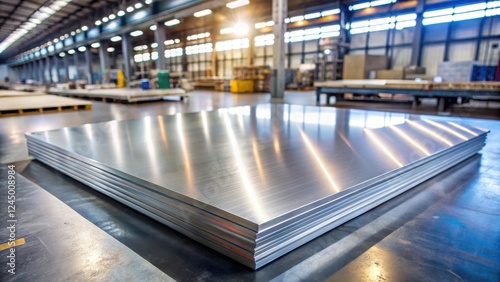 Fototapeta premium Silver metal sheet with high tensile strength and corrosion resistance in a workshop setting, alloy properties, metallic materials