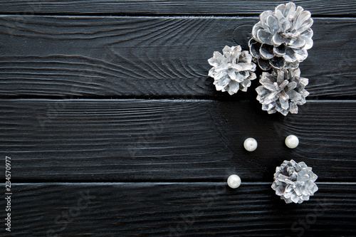 © Nataliia, Obraz premium Silver pine cones and a heap of white beads on black wooden table. Free space for text.