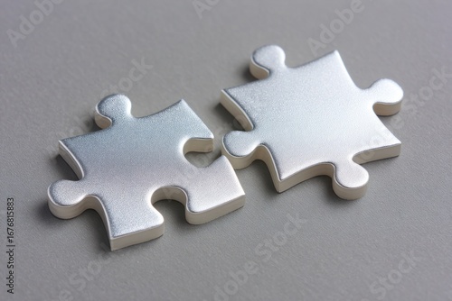 Obraz premium Silver puzzle pieces interlocking, symbolizing teamwork, strategic problem solving, and collaborative progress against neutral background