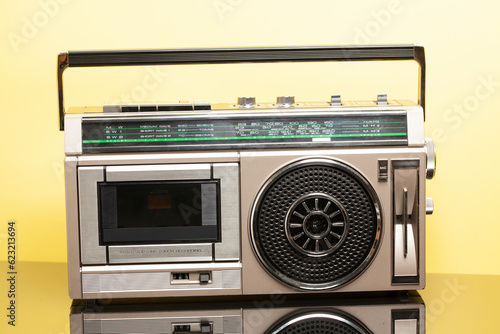 Fototapeta premium Silver retro ghetto radio boom box cassette recorder from 80s on a yellow...