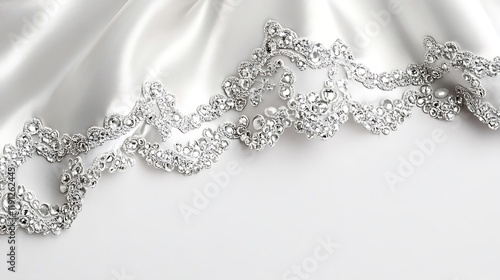 Fototapeta premium Silver Rhinestone Lace on White Satin Fabric